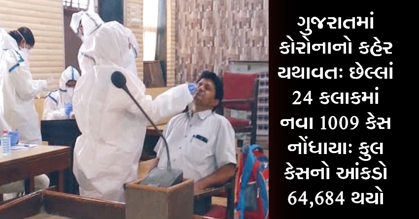 ગુજરાતમાં કોરોનાનો કહેર યથાવત: છેલ્લાં 24 કલાકમાં નવા 1009 કેસ નોંધાયા: કુલ કેસનો આંકડો 64,684 થયો