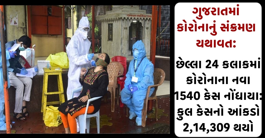 ગુજરાતમાં કોરોનાનું સંક્રમણ યથાવત: છેલ્લા 24 કલાકમાં કોરોનાના નવા 1540 કેસ નોંધાયા: કુલ કેસનો આંકડો 2,14,309 થયો