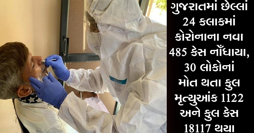 ગુજરાતમાં છેલ્લાં 24 કલાકમાં કોરોનાના નવા 485 કેસ નોઁધાયા, 30 લોકોનાં મોત થતા કુલ મૃત્યુઆંક 1122 અને કુલ કેસ 18117 થયા