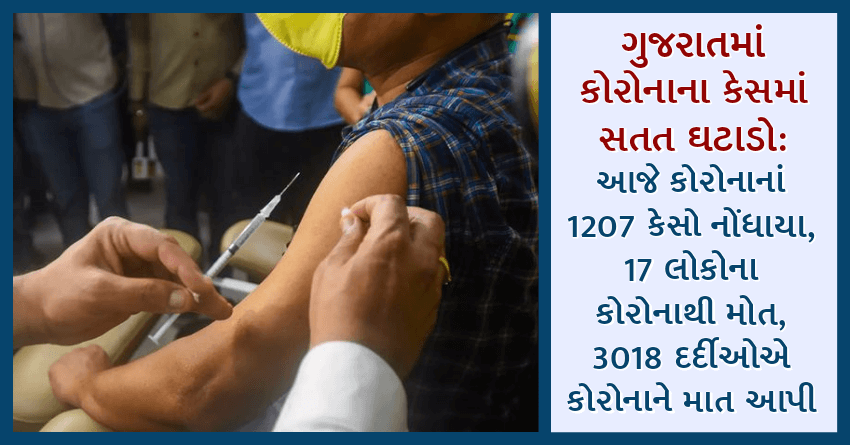 ગુજરાતમાં કોરોનાના કેસમાં સતત ઘટાડો: આજે કોરોનાનાં 1207 કેસો નોંધાયા, 17 લોકોના કોરોનાથી મોત, 3018 દર્દીઓએ કોરોનાને માત આપી