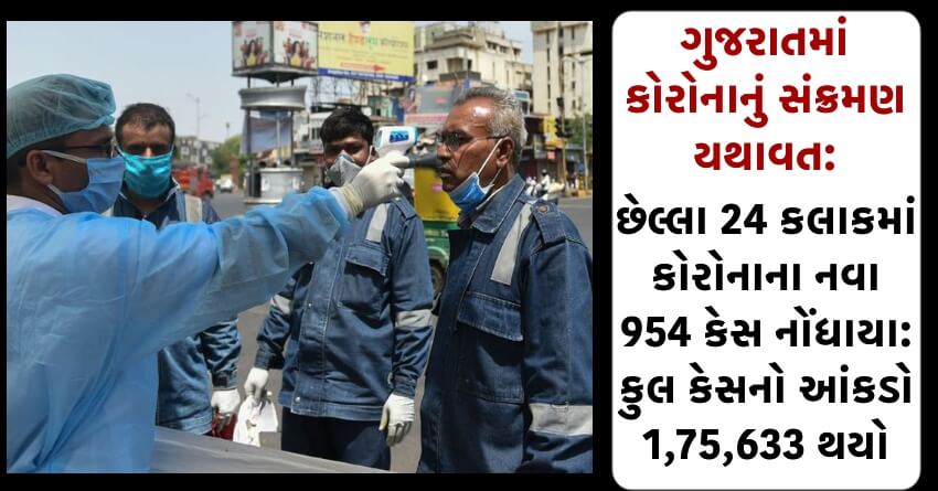 ગુજરાતમાં કોરોનાનું સંક્રમણ યથાવત: છેલ્લા 24 કલાકમાં કોરોનાના નવા 954 કેસ નોંધાયા: કુલ કેસનો આંકડો 1,75,633 થયો