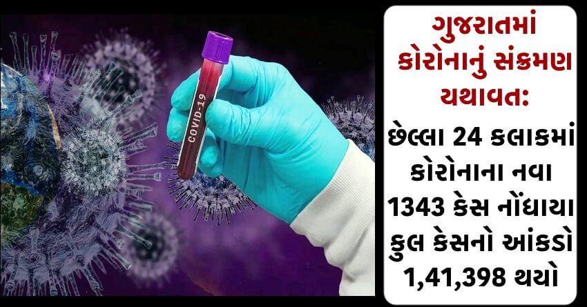 ગુજરાતમાં કોરોનાનું સંક્રમણ યથાવત: છેલ્લા 24 કલાકમાં કોરોનાના નવા 1343 કેસ નોંધાયા: કુલ કેસનો આંકડો 1,41,398 થયો