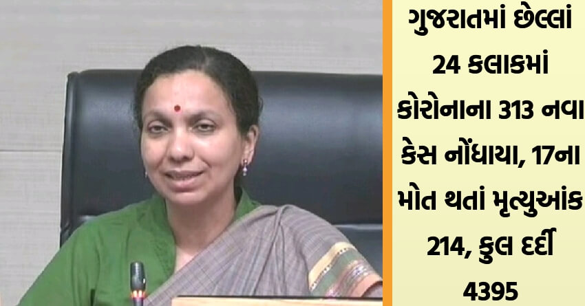 ગુજરાતમાં છેલ્લાં 24 કલાકમાં કોરોનાના 313 નવા કેસ નોંધાયા, 17ના મોત થતાં મૃત્યુઆંક 214, કુલ દર્દી 4395