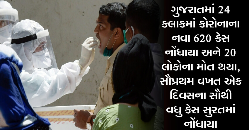 ગુજરાતમાં 24 કલાકમાં કોરોનાના નવા 620 કેસ નોંધાયા અને 20 લોકોના મોત થયા, સૌપ્રથમ વખત એક દિવસના સૌથી વધુ કેસ સુરતમાં નોંધાયા