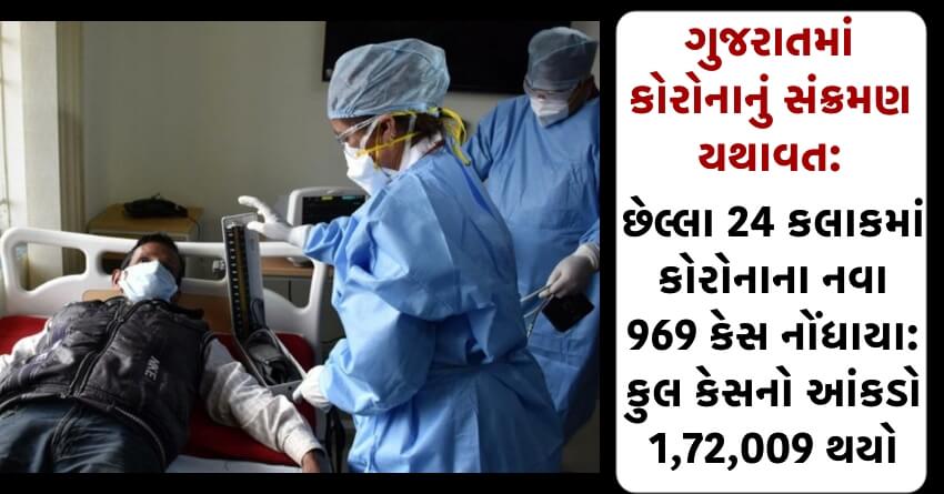 ગુજરાતમાં કોરોનાનું સંક્રમણ યથાવત: છેલ્લા 24 કલાકમાં કોરોનાના નવા 969 કેસ નોંધાયા: કુલ કેસનો આંકડો 1,72,009 થયો