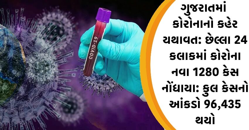 ગુજરાતમાં કોરોનાનો કહેર યથાવત: છેલ્લા 24 કલાકમાં કોરોના નવા 1280 કેસ નોંધાયા: કુલ કેસનો આંકડો 96,435 થયો