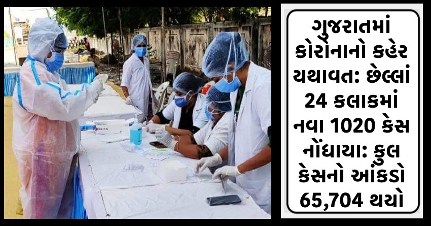 ગુજરાતમાં કોરોનાનો કહેર યથાવત: છેલ્લાં 24 કલાકમાં નવા 1020 કેસ નોંધાયા: કુલ કેસનો આંકડો 65,704 થયો