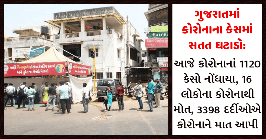 ગુજરાતમાં કોરોનાના કેસમાં સતત ઘટાડો: આજે કોરોનાનાં 1120 કેસો નોંધાયા, 16 લોકોના કોરોનાથી મોત, 3398 દર્દીઓએ કોરોનાને માત આપી