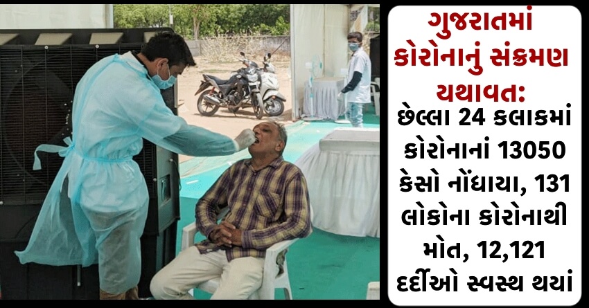 ગુજરાતમાં કોરોનાનું સંક્રમણ યથાવત: છેલ્લા 24 કલાકમાં કોરોનાનાં 13050 કેસો નોંધાયા, 131 લોકોના કોરોનાથી મોત, 12,121 દર્દીઓ સ્વસ્થ થયાં