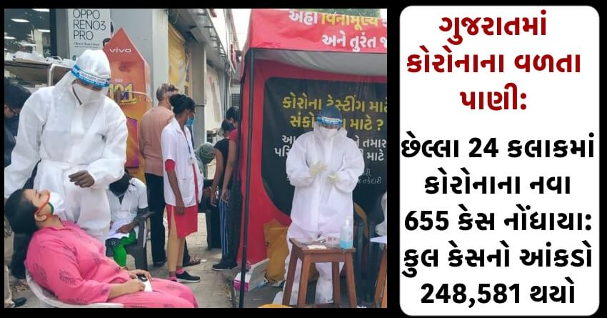 ગુજરાતમાં કોરોનાના વળતા પાણી: છેલ્લા 24 કલાકમાં કોરોનાના નવા 655 કેસ નોંધાયા: કુલ કેસનો આંકડો 248,581 થયો