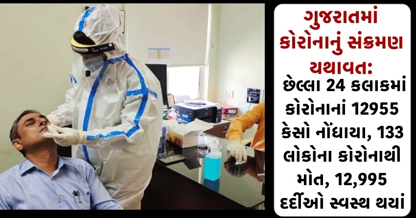 ગુજરાતમાં કોરોનાનું સંક્રમણ યથાવત: છેલ્લા 24 કલાકમાં કોરોનાનાં 12955 કેસો નોંધાયા, 133 લોકોના કોરોનાથી મોત, 12,995 દર્દીઓ સ્વસ્થ થયાં
