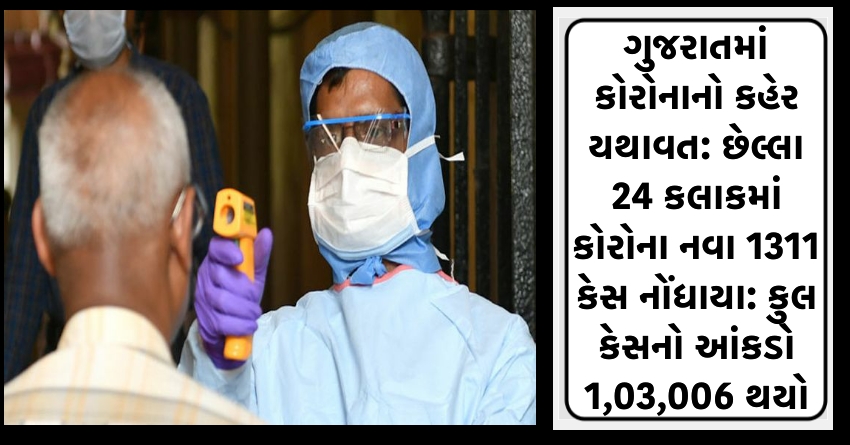 ગુજરાતમાં કોરોનાનો કહેર યથાવત: છેલ્લા 24 કલાકમાં કોરોના નવા 1311 કેસ નોંધાયા: કુલ કેસનો આંકડો 1,03,006 થયો