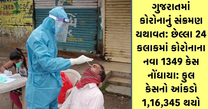 ગુજરાતમાં કોરોનાનું સંક્રમણ યથાવત: છેલ્લા 24 કલાકમાં કોરોનાના નવા 1349 કેસ નોંધાયા: કુલ કેસનો આંકડો 1,16,345 થયો