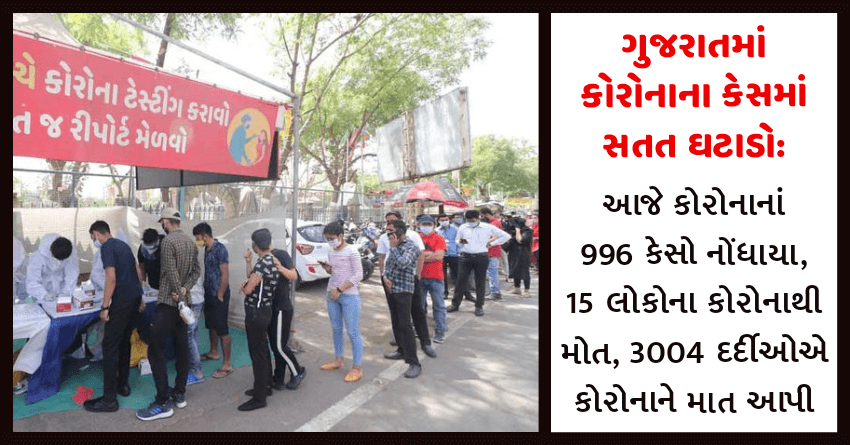 ગુજરાતમાં કોરોનાના કેસમાં સતત ઘટાડો: આજે કોરોનાનાં 996 કેસો નોંધાયા, 15 લોકોના કોરોનાથી મોત, 3004 દર્દીઓએ કોરોનાને માત આપી