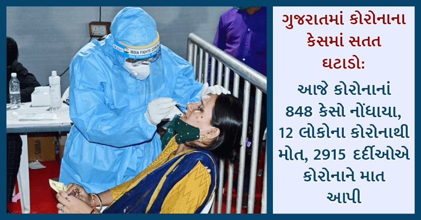 ગુજરાતમાં કોરોનાના કેસમાં સતત ઘટાડો: આજે કોરોનાનાં 848 કેસો નોંધાયા, 12 લોકોના કોરોનાથી મોત, 2915 દર્દીઓએ કોરોનાને માત આપી