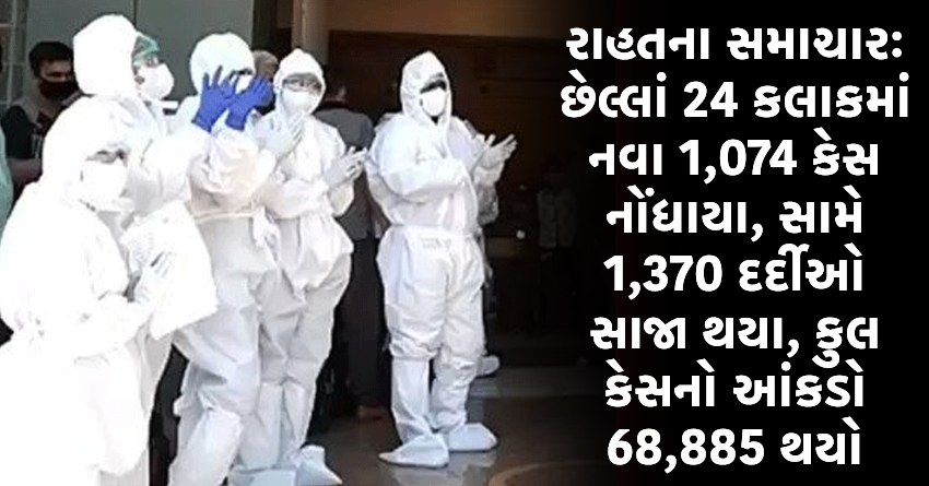રાહતના સમાચારઃ છેલ્લાં 24 કલાકમાં નવા 1,074 કેસ નોંધાયા, સામે 1,370 દર્દીઓ સાજા થયા, કુલ કેસનો આંકડો 68,885 થયો