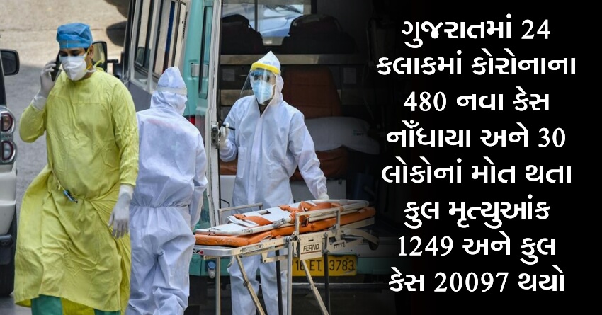 ગુજરાતમાં 24 કલાકમાં કોરોનાના 480 નવા કેસ નોઁધાયા અને 30 લોકોનાં મોત થતા કુલ મૃત્યુઆંક 1249 અને કુલ કેસ 20097 થયો