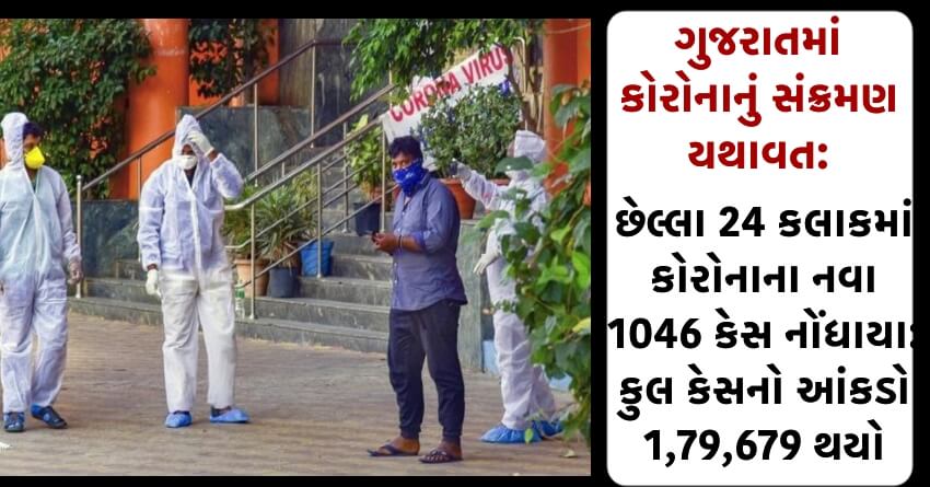 ગુજરાતમાં કોરોનાનું સંક્રમણ યથાવત: છેલ્લા 24 કલાકમાં કોરોનાના નવા 1046 કેસ નોંધાયા: કુલ કેસનો આંકડો 1,79,679 થયો