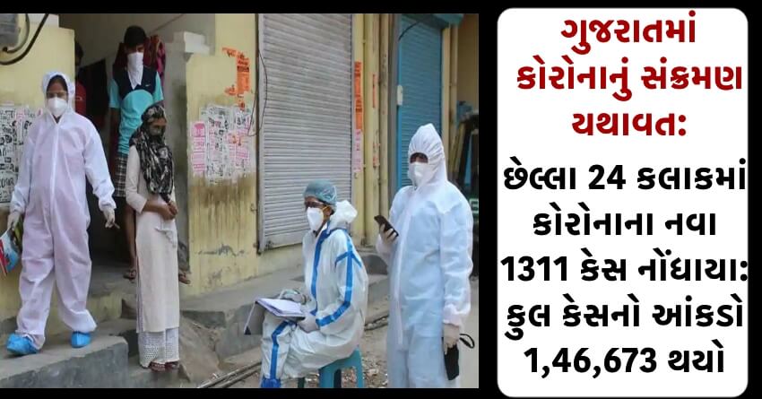 ગુજરાતમાં કોરોનાનું સંક્રમણ યથાવત: છેલ્લા 24 કલાકમાં કોરોનાના નવા 1311 કેસ નોંધાયા: કુલ કેસનો આંકડો 1,46,673 થયો