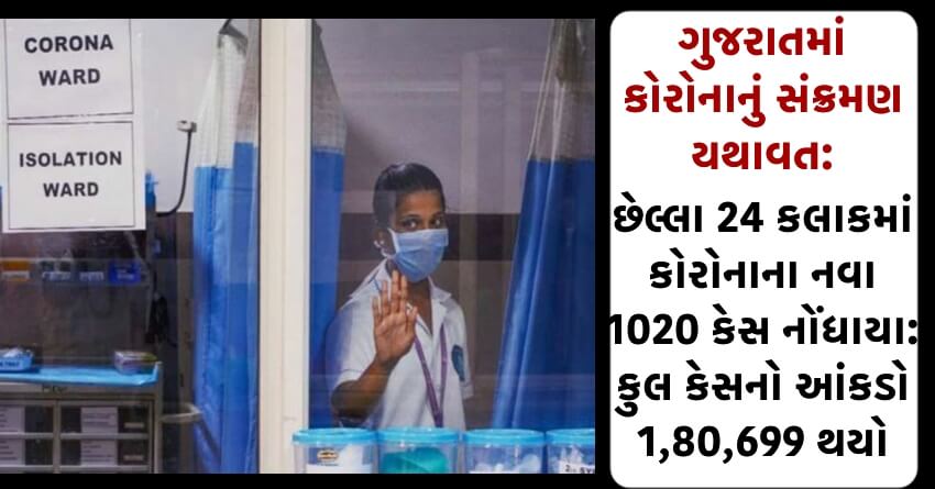 ગુજરાતમાં કોરોનાનું સંક્રમણ યથાવત: છેલ્લા 24 કલાકમાં કોરોનાના નવા 1020 કેસ નોંધાયા: કુલ કેસનો આંકડો 1,80,699 થયો