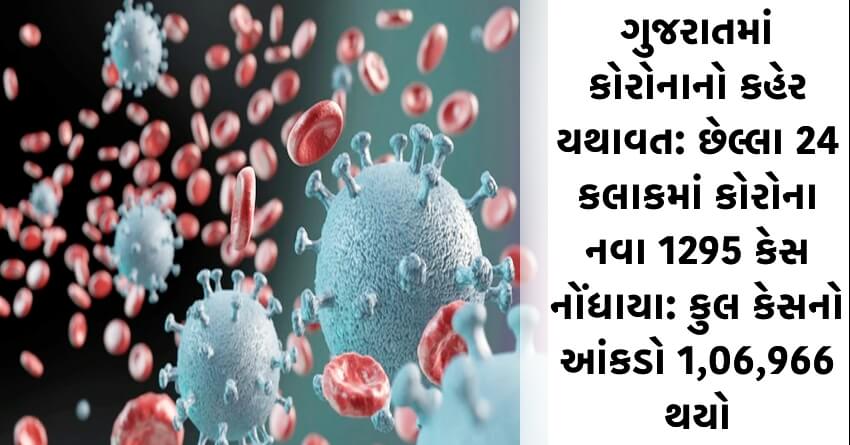 ગુજરાતમાં કોરોનાનો કહેર યથાવત: છેલ્લા 24 કલાકમાં કોરોના નવા 1295 કેસ નોંધાયા: કુલ કેસનો આંકડો 1,06,966 થયો