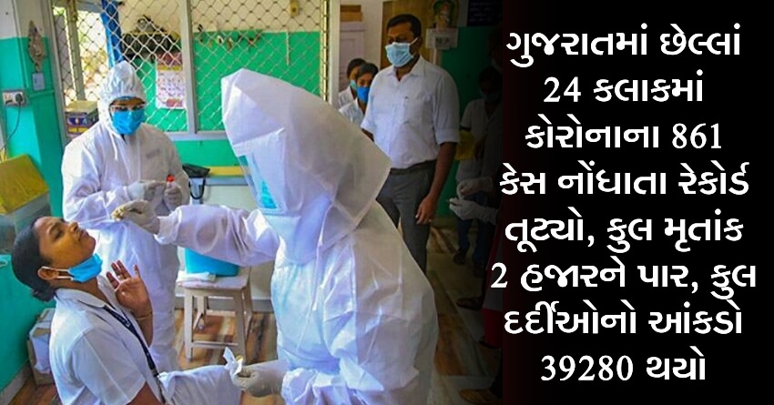 ગુજરાતમાં છેલ્લાં 24 કલાકમાં કોરોનાના 861 કેસ નોંધાતા રેકોર્ડ તૂટ્યો, કુલ મૃતાંક 2 હજારને પાર, કુલ દર્દીઓનો આંકડો 39280 થયો