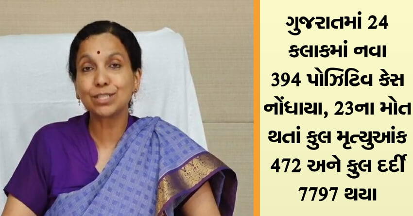 ગુજરાતમાં 24 કલાકમાં નવા 394 પોઝિટિવ કેસ નોંધાયા, 23ના મોત થતાં કુલ મૃત્યુઆંક 472 અને કુલ દર્દી 7797 થયા