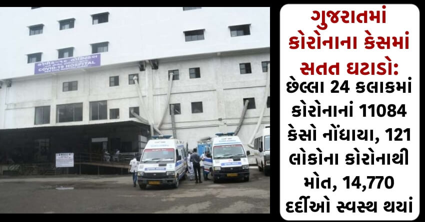ગુજરાતમાં કોરોનાના કેસમાં સતત ઘટાડો: છેલ્લા 24 કલાકમાં કોરોનાનાં 11084 કેસો નોંધાયા, 121 લોકોના કોરોનાથી મોત, 14,770 દર્દીઓ સ્વસ્થ થયાં