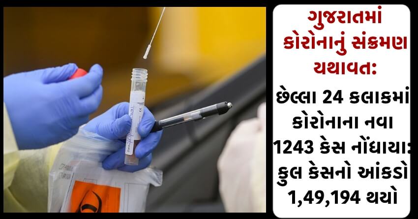 ગુજરાતમાં કોરોનાનું સંક્રમણ યથાવત: છેલ્લા 24 કલાકમાં કોરોનાના નવા 1243 કેસ નોંધાયા: કુલ કેસનો આંકડો 1,49,194 થયો