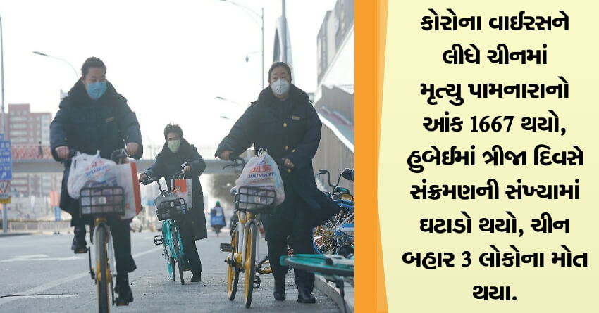 કોરોના વાઈરસને લીધે ચીનમાં મૃત્યુ પામનારાનો આંક 1667 થયો, હુબેઈમાં ત્રીજા દિવસે સંક્રમણની ઘટનામાં ઘટાડો થયો, ચીન બહાર 3 લોકોના મોત થયા