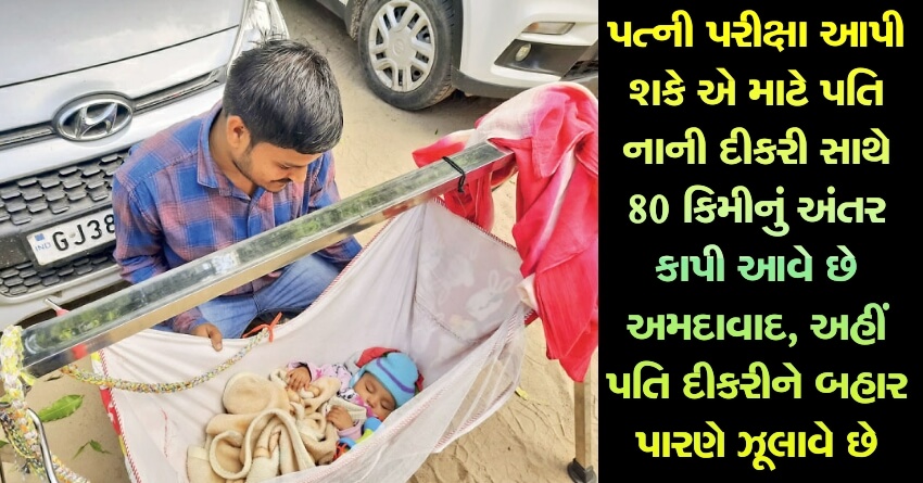 પત્ની પરીક્ષા આપી શકે એ માટે પતિ નાની દીકરી સાથે 80 કિમીનું અંતર કાપી આવે છે અમદાવાદ, અહીં પતિ દીકરીને બહાર પારણે ઝૂલાવે છે