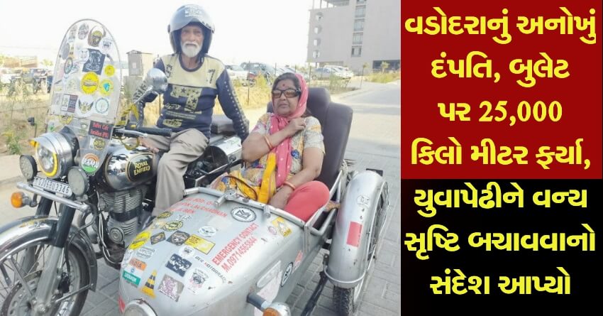 વડોદરાનું 73 વર્ષીય દંપતી રોજ મંદિરે દર્શન કરવા જવાની ઉંમરે વન્ય સૃષ્ટિ બચાવવાનો સમાજિક સંદેશો લઇ યુવા પેઢીને આપવાના આશયથી આશરે બુલેટ પર 25,000 કિલોમીટરની સફર કરી ચુક્યા છે અને હજી પાકિસ્તાન અને અન્ય જગ્યાએ પણ જવાની ઇચ્છા શક્તિ તેમણે દર્શાવી છે. મહત્વનું છે કે, પત્નીનો એક પગ તૂટી જતા પતિએ બુલેટમાં સાઇડકાર લગાવી પત્નીને સાથે રાખી દેશભરમાં પરિભ્રમણ કર્યું. બાઈક ચલાવી વડોદરાના ૭૫ વર્ષના દાદા-દાદીનો પ્રેમ આજના નવયુવાનને શરમાવે તેવો છે. સામાન્ય ઝઘડામાં કોઈ નાની મોટી સમસ્યાના કારણે કપલ અલગ થઇ જતા હોય છે, પરંતુ આ દંપતીએ નિવૃત્તિ પછી સમગ્ર દેશમાં બુલેટ પર ફરવાનું નક્કી કર્યું છે. દાદાએ દાદીને વચન આપેલું કે તને બુલેટ પર બેસાડી ફેરવીશ અને દાદાએ દાદીને આપેલું આ વચન નિભાવ્યું છે.
