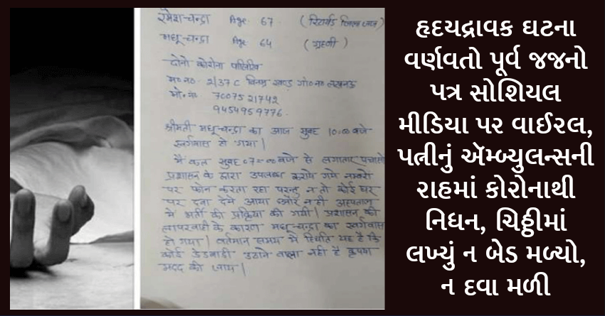 હૃદયદ્રાવક ઘટના વર્ણવતો પૂર્વ જજનો પત્ર સોશિયલ મીડિયા પર વાઈરલ, પત્નીનું ઍમ્બ્યુલન્સની રાહમાં કોરોનાથી નિધન, ચિઠ્ઠીમાં લખ્યું ન બેડ મળ્યો, ન દવા મળી