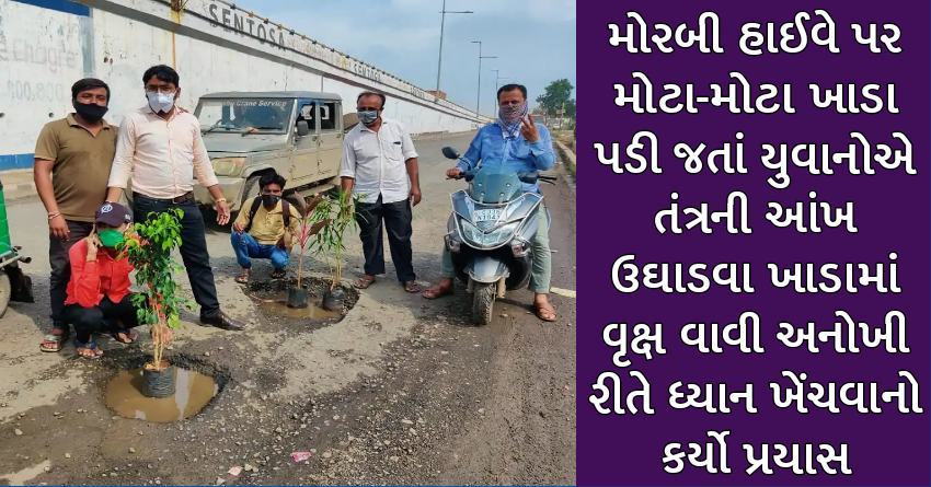મોરબી હાઈવે પર મોટા-મોટા ખાડા પડી જતાં યુવાનોએ તંત્રની આંખ ઉઘાડવા ખાડામાં વૃક્ષ વાવી અનોખી રીતે ધ્યાન ખેંચવાનો કર્યો પ્રયાસ