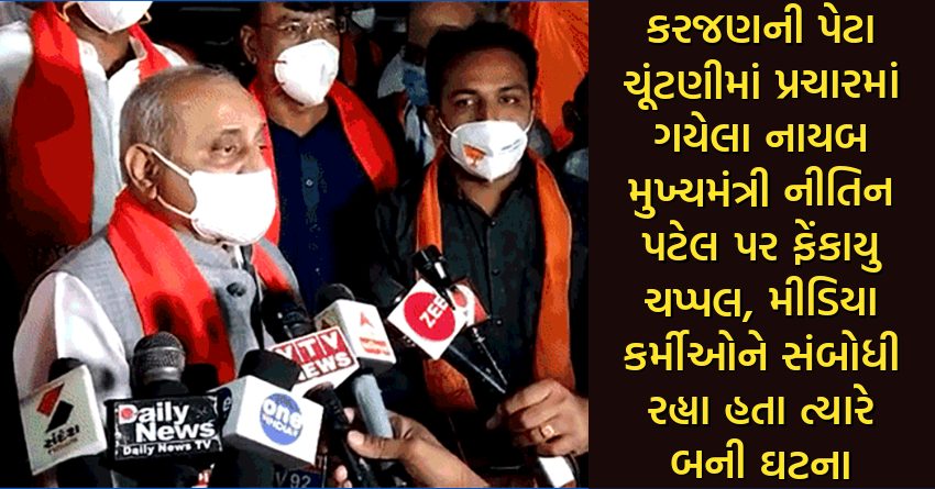 કરજણની પેટા ચૂંટણીમાં પ્રચારમાં ગયેલા નાયબ મુખ્યમંત્રી નીતિન પટેલ પર ફેંકાયુ ચપ્પલ, મીડિયા કર્મીઓને સંબોધી રહ્યા હતા ત્યારે બની ઘટના