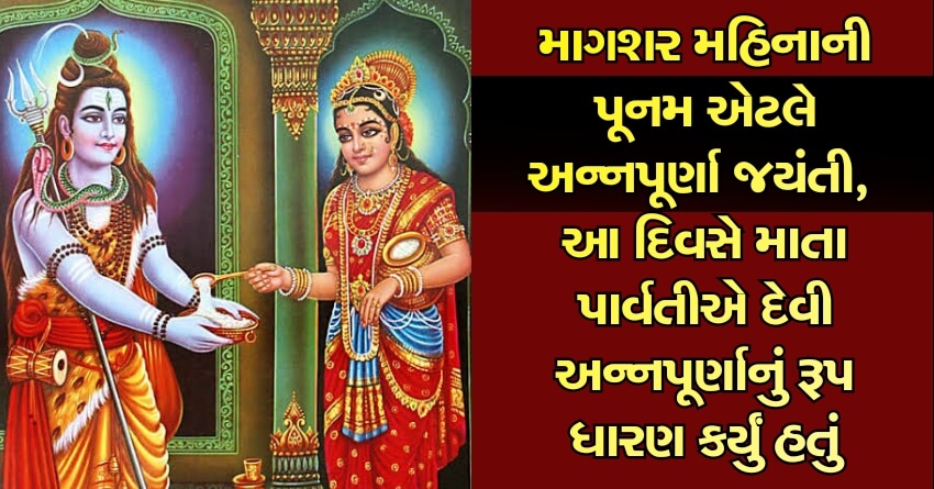 માગશર મહિનાની પૂનમના દિવસે અન્નપૂર્ણા જયંતી ઉજવવામાં આવે છે. કાશી હિન્દુ વિશ્વવિદ્યાલયના પં. ગણેશ મિશ્રાના જણાવ્યા પ્રમાણે આ તિથિએ માતા પાર્વતીએ અન્નપૂર્ણા રૂપ ધારણ કર્યું હતું. શાસ્ત્રો પ્રમાણે આ દિવસે રસોઈઘરમાં ચુલા વગેરેનું પૂજન કરવાથી ઘર-પરિવારમાં ક્યારેય અન્ન અને ધન-ધાન્યની ખોટ નથી રહેતી. આમ તો અન્નનો અનાદર ક્યારેય ન કરવો જોઈએ, પરંતુ આ દિવસે ખાસ સાવધાની રાખવી જોઈએ. એવું માનવામાં આવે છે કે આ દિવસે રસોઈ, ચુલા(ગેસની સગડી કે સ્ટવ)નું પૂજન કરવાથી ઘરમાં ક્યારેય ધન-ધાન્યની ખોટ નથી રહેતી અને દેવીની કૃપા હંમેશાં ઘર પર રહે છે.