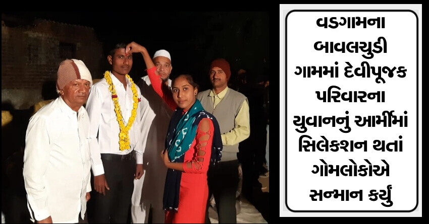 વડગામના બાવલચુડી ગામના દેવીપૂજક યુવાનનું ઈન્ડિયન આર્મી રેન્કિગમાં આર્ટિલરી ટ્રેનીંગમાં પોસ્ટીન્ગ થયું હતું. બાવલચુડી ગામના દેવીપૂજક પરિવારમાંથી સરકારી જોબ મેળવનાર સહુ પ્રથમ હોવાથી સમાજ સહિત ગોમલોકોએ સન્માન કર્યું હતું.
