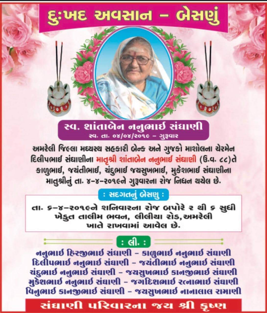 અમરેલીના પૂર્વ ધારાસભ્ય, પૂર્વ સાંસદ, રાજયના પૂર્વ મંત્રી અને અમરેલી જિલ્લા મધ્યસ્થ સહકારી બેન્કના અને ગૂજકોમશોલના ચેરમેન દિલીપભાઈ સંઘાણીના માતુશ્રી શાંતાબેન નનુભાઈ સંઘાણી (ઉ.વ.૮૮) તથા કાળુભાઇ, જયંતીભાઈ, ચંદુભાઈ, જયસુખભાઈ, મુકેશભાઈ સંઘાણીના માતુશ્રીનું 88 વર્ષની વયે ગઈ કાલે અમરેલી ખાતે નિધન થયેલ છે.
