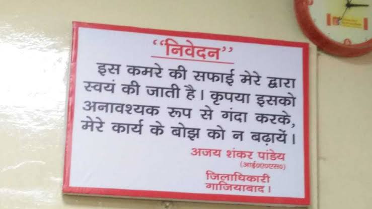 વડાપ્રધાન નરેન્દ્ર મોદીના સ્વચ્છતા અભિયાનથી પ્રેરિત થઈને ગાઝિયાબાદના કલેક્ટર અજય શંકર પાંડે પોતે જ પોતાની ઑફિસમાં ઝાડૂથી સફાઈ કરે છે. તેમણે મંગળવારે પોતે સફાઈ કરી પોતાની ઑફિસની બહાર બોર્ડ લગાવી દીધું કે, આ રૂમની સફાઈ હું પોતે કરું છું અને અનાવશ્યક રીતે તેને ગંદો કરી મારા કામનો ભાર ન વધારો.