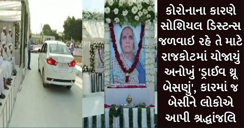 રાજકોટમાં અનોખી રીતે બેસણાનો કાર્યક્રમ યોજાયો હતો. જે અંતર્ગત કોરોના મહામારીના કારણે સોશિયલ ડિસ્ટન્સ જળવાઇ રહે તેમજ માસ્ક સહિતના નિયમોનું પાલન થઈ શકે તે માટે ” ડ્રાઇવ થ્રૂ બેસણું ” (Drive-through besana) નામનો કાર્યક્રમ યોજાયો હતો.