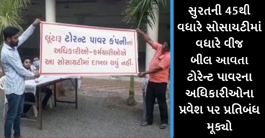 સુરતની 45થી વધારે સોસાયટીમાં વધારે વીજ બીલ આવતા ટોરેન્ટ પાવરના અધિકારીઓના પ્રવેશ પર પ્રતિબંધ મૂક્યો