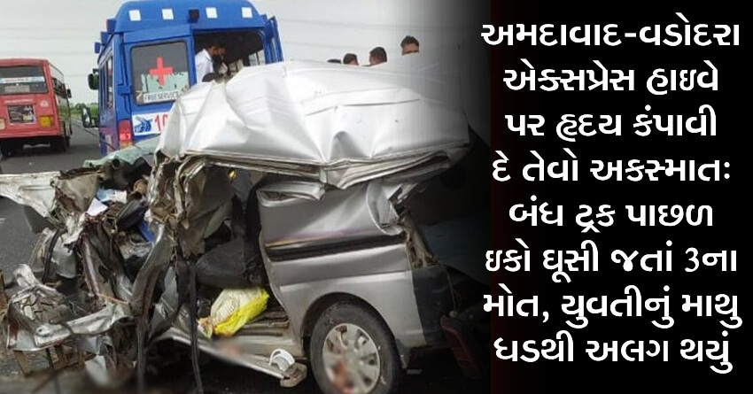 અમદાવાદ- વડોદરા એક્સપ્રેસ હાઇવે પર હૃદય કંપાવી દે તેવો અકસ્માત: બંધ ટ્રક પાછળ ઇકો ઘૂસી જતાં 3ના મોત, યુવતીનું માથુ ધડથી અલગ થયું