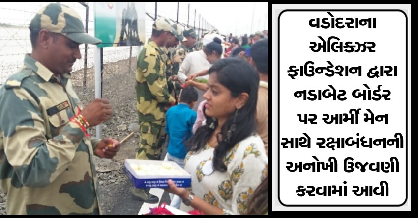 વડોદરા શહેરમાં ચાલતુ એલિક્ઝર ફાઉન્ડેશન દ્વારા જરૂરીયાતમંદ સ્ટુડન્ટને ભણવા માટે મદદ કરે છે. આ ઉપરાંત ગરીબ બાળકોને પણ મદદરૂપ થાય છે. એલિક્ઝર ફાઉન્ડેશન દ્વારા આ વર્ષે વડોદરા શહેરની 12 સ્કૂલોમાંથી 4500 જેટલી રાખડીઓ એકત્રિત કરી હતી. અને રક્ષાબંધન નિમિત્તે 30 લોકોનું ગૃપ કચ્છમાં આવેલી નડાબેટ બોર્ડર ખાતે પહોંચી ગયું હતું. અને બોર્ડર પર જ્યારે વડોદરાની યુવતીઓએ આર્મી જવાનોને રાખડી બાંધી ત્યારે તેમની આંખોમાં આસું આવી ગયા હતા. અને જણાવ્યું હતું કે, અમને ગુજરાતમાં છીએ પણ ક્યારેય હોમ સિકનેસ લાગતી નથી. તમે અમારી સાથે રક્ષાબંધનની ઉજણી કરી તે ખુબ સારૂ લાગ્યું, તમે ભવિષ્યમાં પણ આવજો.
