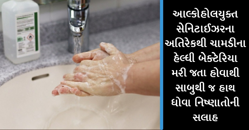 આલ્કોહોલયુક્ત સેનિટાઈઝરના અતિરેકથી ચામડીના હેલ્ધી બેક્ટેરિયા મરી જતા હોવાથી સાબુથી જ હાથ ધોવા નિષ્ણાતોની સલાહ