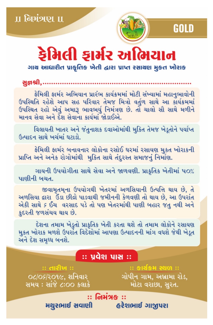 ગાય આધારિત પ્રાકૃતિક ખેતી દ્વારા રસાયણ મુક્ત ખોરાક માટે “ફેમિલી ફાર્મર અભિયાન”