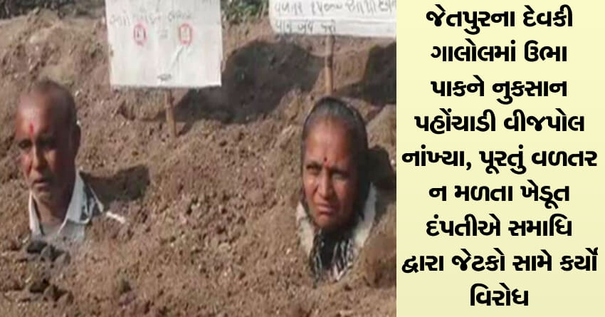 જેતપુરના દેવકી ગાલોલમાં ઉભા પાકને નુકસાન પહોંચાડી વીજપોલ નાંખ્યા, પૂરતું વળતર ન મળતા ખેડૂત દંપતીનો સમાધિ દ્વારા જેટકો સામે કર્યો વિરોધ