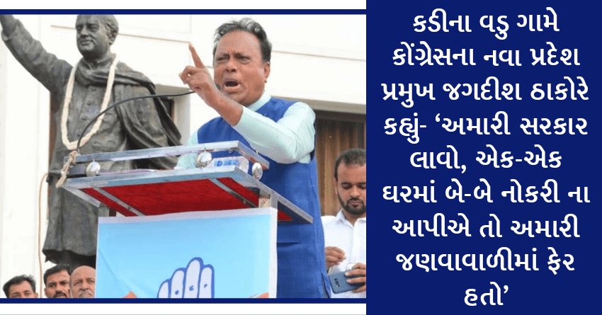 કડીના વડુ ગામે કોંગ્રેસના નવા પ્રદેશ પ્રમુખ જગદીશ ઠાકોરે કહ્યું- ‘અમારી સરકાર લાવો, એક-એક ઘરમાં બે-બે નોકરી ના આપીએ તો અમારી જણવાવાળીમાં ફેર હતો’