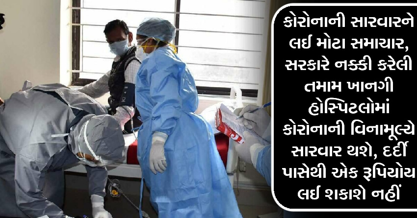 કોરોનાની સારવારને લઈ મોટા સમાચાર, સરકારે નક્કી કરેલી તમામ ખાનગી હોસ્પિટલોમાં કોરોનાની વિનામૂલ્યે સારવાર થશે, દર્દી પાસેથી એક રૂપિયોય લઈ શકાશે નહીં