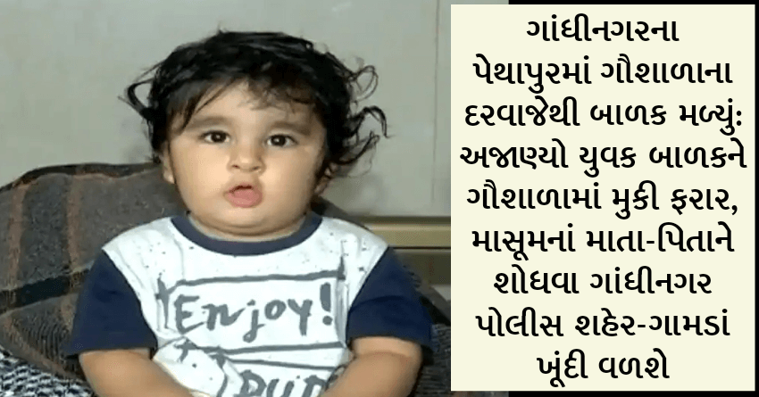 ગાંધીનગરના પેથાપુરમાં ગૌશાળાના દરવાજેથી બાળક મળ્યું: અજાણ્યો યુવક બાળકને ગૌશાળામાં મુકી ફરાર, માસૂમનાં માતા-પિતાને શોધવા ગાંધીનગર પોલીસ શહેર-ગામડાં ખૂંદી વળશે