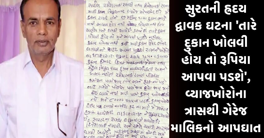 સુરતની હ્રદય દ્વાવક ઘટના ‘તારે દુકાન ખોલવી હોય તો રૂપિયા આપવા પડશે’, વ્યાજખોરોના ત્રાસથી ગેરેજ માલિકનો આપઘાત